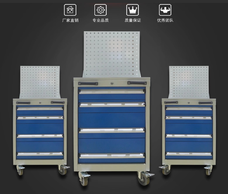 2、工具車(chē)由各種型號(hào)的工具柜增加頂柜和腳輪等移動(dòng)部件組成。